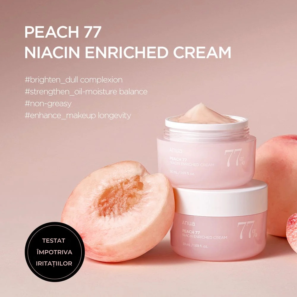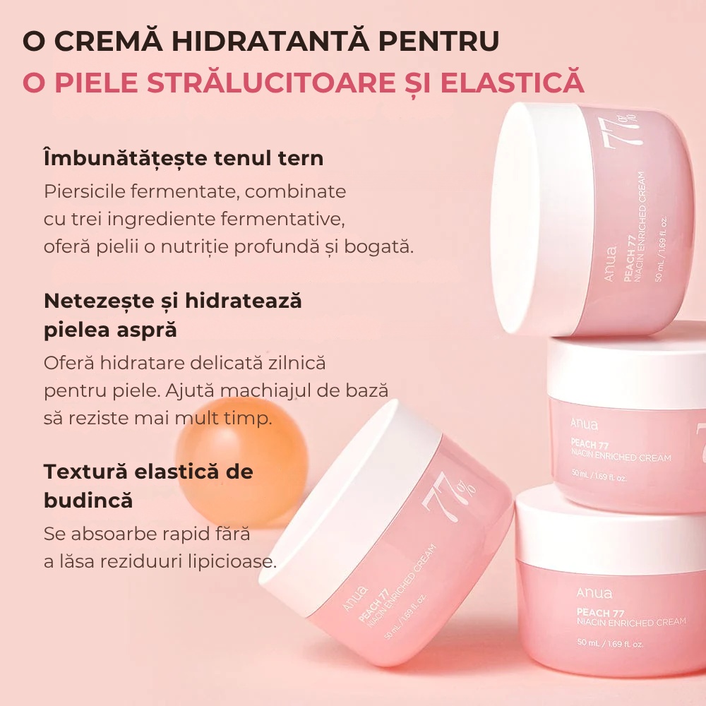 Descriere principală: Dacă vrei luminozitate reală, nu doar de la ring light, Anua Peach 77 Niacin Enriched Cream e acel tip de cremă care îți dă glow-ul curat, nu luciul de sebum. Este o cremă cu niacinamidă Anua care a devenit virală tocmai pentru că livrează exact ce promite — piele mai uniformă, mai netedă și cu o strălucire naturală. Formula combină extract de piersică (77%) cu niacinamidă, un duo clasic K-beauty pentru un ten “glass-like”, dar sănătos. Textura e ușoară, fină, se absoarbe rapid și lasă pielea moale, fără senzație grasă. A câștigat teren printre produsele virale coreene nu prin marketing, ci prin efectul vizibil: pielea arată hidratată, echilibrată și… bine odihnită chiar și după o noapte scurtă. Cum funcționează: Crema cu niacinamidă Anua lucrează inteligent pe mai multe niveluri. Extractul de piersică hidratează și hrănește pielea cu antioxidanți, în timp ce niacinamida (vitamina B3) reglează producția de sebum, reduce petele pigmentare și netezește textura pielii. În paralel, panthenolul și ceramidele ajută la întărirea barierei cutanate, ceea ce face ca efectul de uniformizare să fie dublat de un confort real. Formula e echilibrată — destul de hidratantă pentru a hrăni pielea uscată, dar suficient de lejeră pentru a fi folosită și pe ten mixt sau gras. E genul de cremă care aduce echilibru: glow controlat, nu “oil slick”. Filozofia noastră: Îngrijirea ca respect de sine La Gliskin , credem că îngrijirea pielii nu este o vanitate sau o corvoadă, ci una dintre cele mai sincere forme de grijă și respect față de tine însuți. Promovăm filozofia K-Beauty, care se concentrează pe hrănirea, protejarea și înțelegerea pielii pe termen lung , în loc de soluții agresive sau de reparații pe termen scurt. De aceea, selectăm cu atenție inovații coreene autentice care transformă rutina zilnică dintr-o obligație într-un ritual de plăcere. Produsele noastre nu doar rezolvă probleme punctuale, ci îmbunătățesc fundamental sănătatea pielii , ajutându-te să te simți extraordinar în propria piele, în fiecare zi. Beneficii: Luminează și uniformizează tonul pielii Hidratează în profunzime fără să încarce Întărește bariera pielii și reduce sensibilitatea Lasă pielea moale, netedă și cu un aspect vizibil mai proaspăt Este potrivită pentru: Perfectă pentru cei care vor o cremă de zi sau de noapte care aduce hidratare, dar și beneficii de uniformizare. Potrivită pentru toate tipurile de piele, inclusiv cea mixtă sau sensibilă. Este alegerea ideală pentru tenurile care se confruntă cu pete, textură neuniformă sau lipsă de luminozitate, dar nu vor o formulă grea sau grasă. Ingrediente cheie: Extract de piersică (77%) – bogat în vitamine și antioxidanți, hidratează și oferă strălucire naturală. Niacinamidă (vitamina B3) – reduce petele, reglează sebumul și îmbunătățește textura pielii. Panthenol – calmează și repară bariera cutanată. Ceramide – protejează pielea de pierderea apei și o mențin suplă. Formula e curată, fără parfum și alcool, concepută să ofere rezultate reale fără iritații. Anua e sinonim cu “echilibru” în lumea K-beauty. Filosofia lor e simplă: formule curate, eficiente, care respectă bariera pielii. Gama Peach combină extracte naturale de fructe cu ingrediente active moderne pentru a oferi hidratare și luminozitate fără efect gras. Dacă vrei să amplifici efectul cremei, poți combina cu Anua Peach 70 Niacin Serum , care pregătește pielea pentru un efect de glow uniform, sau cu Anua Heartleaf 77 Soothing Toner , pentru un strat de calmare înainte de aplicare. Împreună, formează una dintre cele mai echilibrate rutine pentru ten tern sau sensibil — luminozitate controlată, hidratare fără greutate și zero iritații. Mix & Match Like a Pro: Pentru o rutină simplificată: Dacă vrei un look fresh fără 10 pași de skincare, combină Anua Peach 77 Niacin Enriched Cream cu Anua Heartleaf 77 Soothing Toner — tonerul calmează și hidratează instant, pregătind pielea pentru aplicarea cremei, astfel încât efectul de luminozitate e mai uniform. Pentru zilele în care ai nevoie și de protecție solară, finalizează cu Anua Heartleaf Silky Moisture Sun Cream SPF50+ . E combinația simplă, dar sigură: calmare, hidratare și protecție, fără straturi grele și fără compromisuri. Pentru o rutină completă (versiunea “skincare geek”): Dacă îți place layering-ul coreean adevărat, poți construi o rutină completă care pune în valoare crema. Începe seara cu Anua Heartleaf Pore Control Cleansing Oil pentru a îndepărta machiajul și impuritățile, apoi continuă cu Anua 8 Hyaluronic Acid Hydrating Gentle Foaming Cleanser pentru curățare delicată pe bază de apă. Aplică Anua Heartleaf 77 Soothing Toner pentru calmare și hidratare inițială, apoi urmează cu Anua Peach 70 Niacin Serum — partenerul perfect al cremei, care adaugă un plus de luminozitate și uniformizare. Încheie rutina cu Anua Peach 77 Niacin Enriched Cream , pentru hidratare intensă și glow natural. Dimineața, păstrează același ton de echilibru și finalizează rutina cu Anua Heartleaf Silky Moisture Sun Cream SPF50+ — protecția ideală care completează efectul antioxidant al niacinamidei, fără să lase peliculă albă sau senzație grasă. Această combinație transformă crema cu niacinamidă Anua într-un pas central al unei rutine echilibrate — hidratare, luminozitate și protecție, toate în același ritm curat și minimalist specific brandului. Proprietăți Crema îmbogățită cu piersici 77 niacinamidă de la ANUA este o cremă ușoară, neaderentă, formulată cu piersici fermentate și niacinamidă pentru a hidrata și netezi pielea. Ajută la menținerea barierei de hidratare a pielii, lăsând pielea moale și suplă, fără greutate. Crema este potr